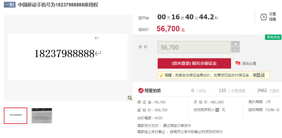 河南省洛阳市洛龙区人民法院将于2020年10月16日10时至2020年10月17日10时止(延时的除外)在洛龙区人民法院阿里巴巴司法拍卖网络平台上对号码18237988888进行公开拍卖活动,中国移动18237988888手机号码,起拍价:56700元,保证金:5700元,增价幅度:200元。此号码为一类吉祥号码,按照管理办法过户后执行的标准为:承诺低消1888元/月。号码距离开拍不足24小时,目前已有133人设置提醒,2962人围观。